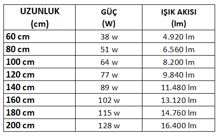 Metre – Watt – Lümen Tablosu