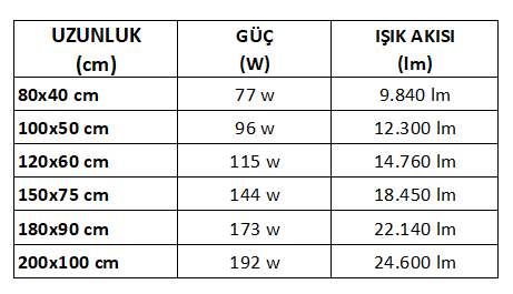 Metre – Watt – Lümen Tablosu