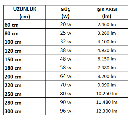 Metre – Watt – Lümen Tablosu